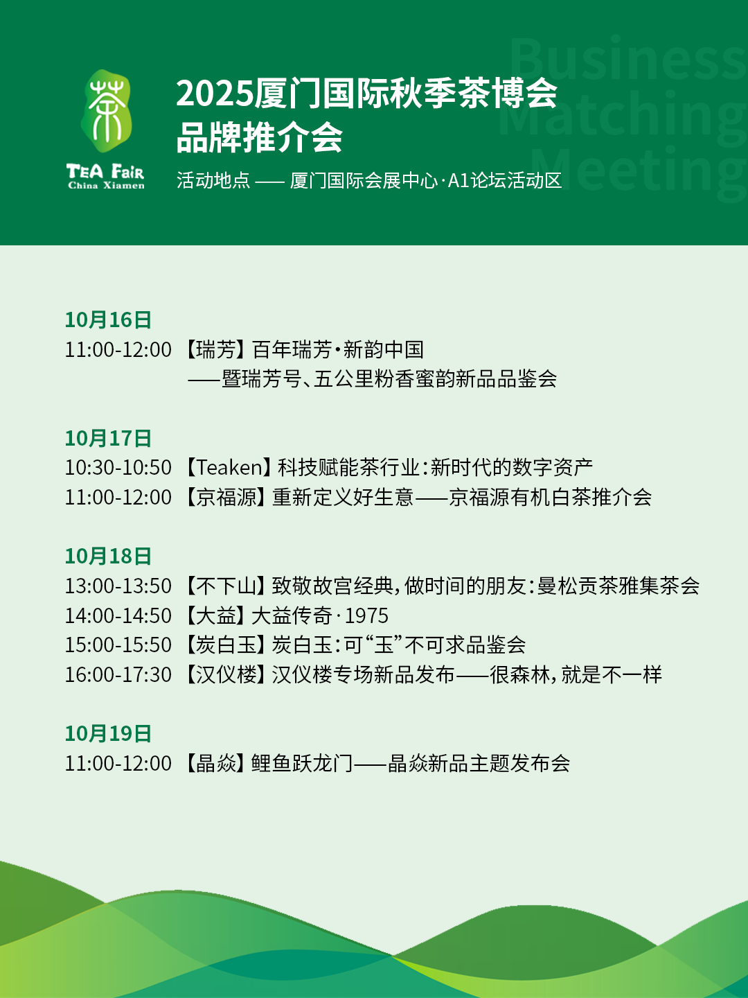 厦门国际茶博会 始终践行“产业为体,文化为魂”的发展理念,打造全球茶产业链的资源配置中心,搭建传统文化与创新表达的试验场!从一片茶叶到千亿产业,从古老技艺到现代品牌,2025厦门国际秋季茶博会将举办一系列专业度高、信息量大、富有文化内涵与底蕴的精彩活动,汇聚品牌创始人、龙头企业、行业协会及高校等各方力量,构建专业交流平台,传递行业最新资讯,助推产业转型升级!